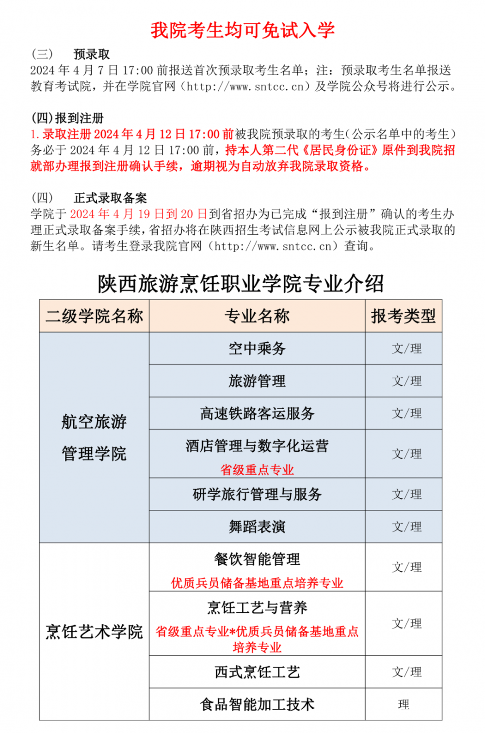 文化素质测试时间:3月20日14:30-16:30 2024年4月7日17:00前报送首次预录取考生名单;注:预录取考生名单报送教育考试院,并在学院官网(http://www.sntcc.cn)及学院公众号将进行公示。 1.录取注册2024年4月12日17:00前被我院预录取的考生(公示名单中的考生)务必于2024年4月12日17:00前,持本人第二代《居民身份证》原件到我院招就部办理报到注册确认手续,逾期视为自动放弃我院录取资格。 学院于2024年4月19日到20日到省招办为已完成“报到注册”确认的考生办理正式录取备案手续,省招办将在陕西招生考试信息网上公示被我院正式录取的新生名单。请考生登录我院官网(http://www.sntcc.cn)查询。